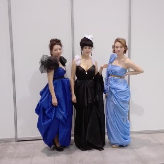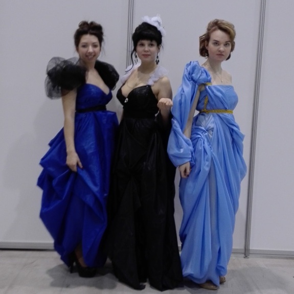 Так, Ирина Жарких, Анастасия Ковыршина, Дарья Баранова, Анна Борисовская, Ксения Тришина (группа 3К-11) провели мастер-класс «Художественный образ» по выполнению вечернего костюма на фигуре методом наколки. Образ завершали прическа, аксессуары, обувь.