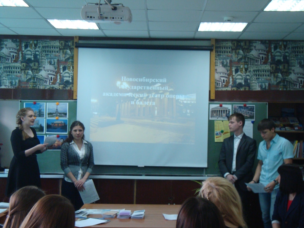 Урок прошёл как одно мгновение. Всё было рассчитано буквально по минутам. Ведь «экскурсионный маршрут» охватывал достаточно большое количество театров Новосибирска: «Глобус», Академический театр оперы и балета. «Старый Дом», «Красный факел», Театр музыкальной комедии.