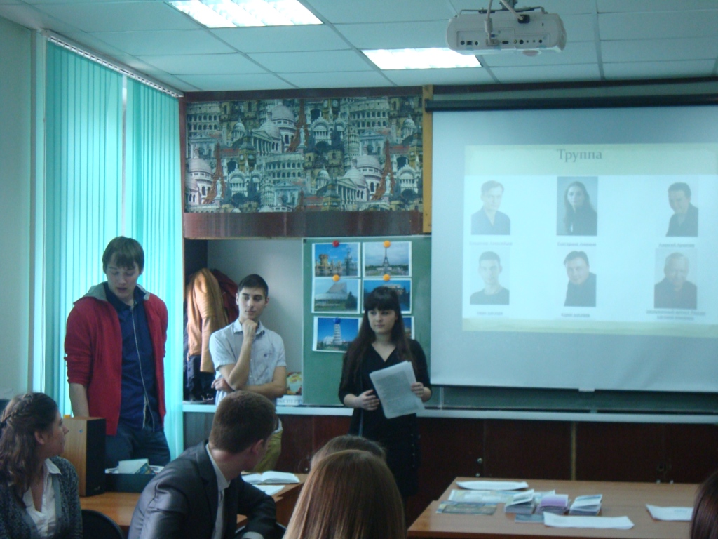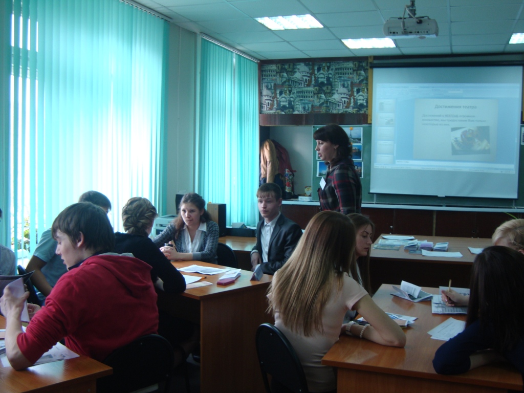 По ходу занятия малые группы менялись ролями, выступая в роли «специалистов» или в роли «экспертов», оценивающих очередную презентацию в соответствии с критериями, выданными педагогом. Кроме видеопрезентации каждая «экскурсионная группа» разработала и изготовила буклеты о том театре, который представляла.