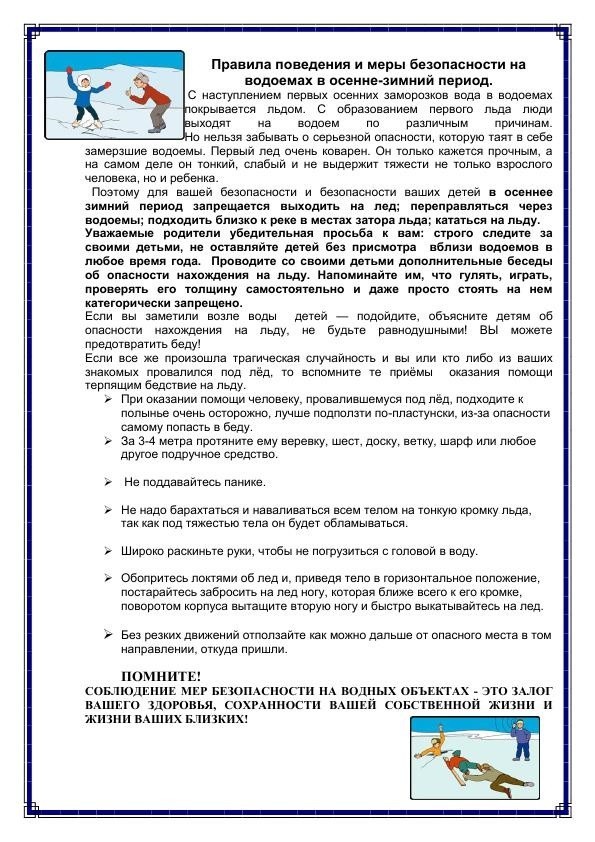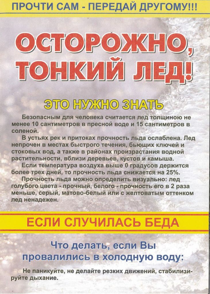 Становятся чаще случаи чрезвычайных происшествий с детьми на замерзших водоемах. Не оставляйте детей одних! Заботьтесь о безопасности детей, придерживаясь, правил безопасного поведения в быту. Это стоит Ваших усилий! Воспитывайте у детей навыки культуры безопасного поведения, демонстрируя осторожность на собственном примере. Найдите несколько минут на откровенный разговор с детьми об этом. Помните, что эти минуты будут измеряться ценой жизни. А чтоб не случилась беда, необходимо давать детям четкие знания и умения, как действовать в той или другой ситуации. Помните, что жизнь наших детей зависит только от нас самих!