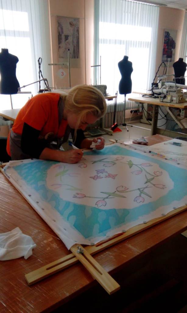 На соревновательной площадке компетенции «Роспись по шелку» изготовление шейного платка подходило к завершению. Изделие каждого участника представляло собой красивую цветочную композицию, неповторимый орнамент украшался птицами, фруктами, разнообразие красок восхищала.