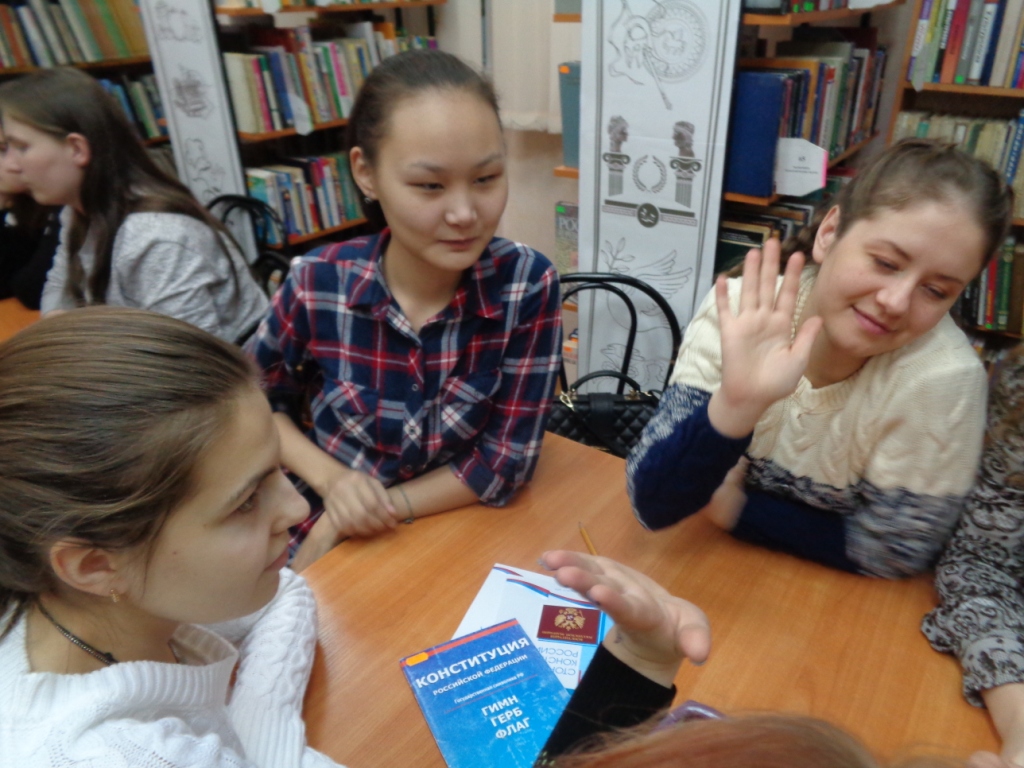 Сотрудники библиотеки рассказали об истории появления Конституции в Российской Федерации, провели блиц-опрос «Мозговой штурм» (вопросы были заданы о символах РФ); игру «Сказка ложь, да в ней намёк…» - в шуточной форме игроки выясняли, какие права были нарушены в той или иной сказке. Последней была викторина «Права или обязанности».