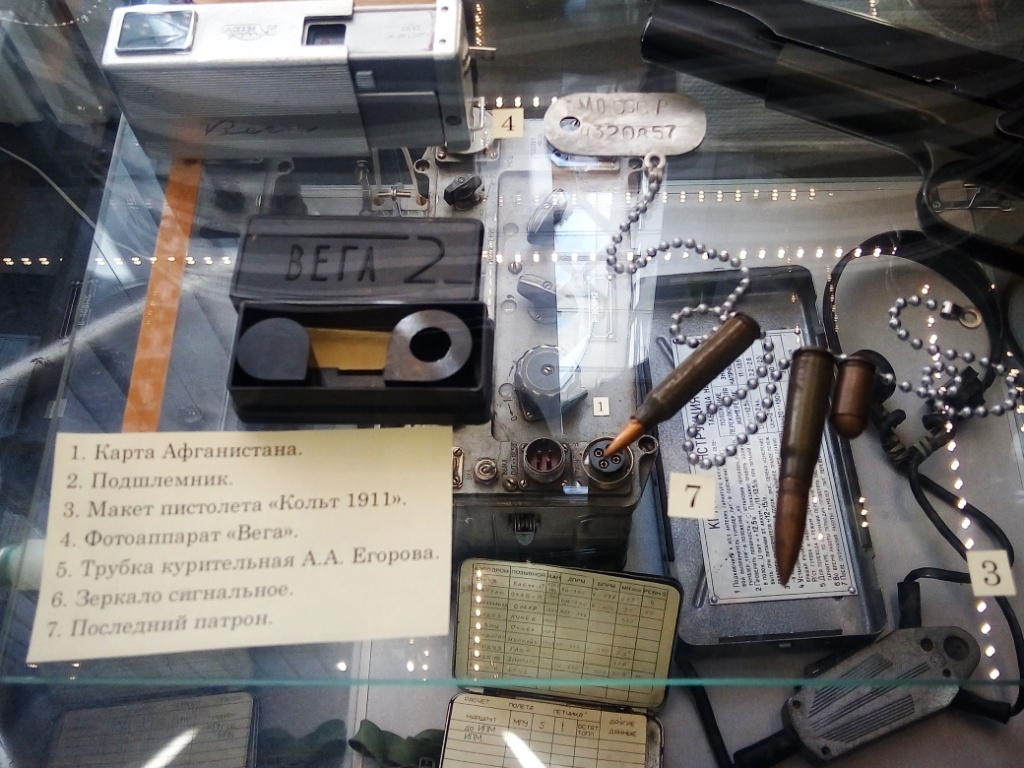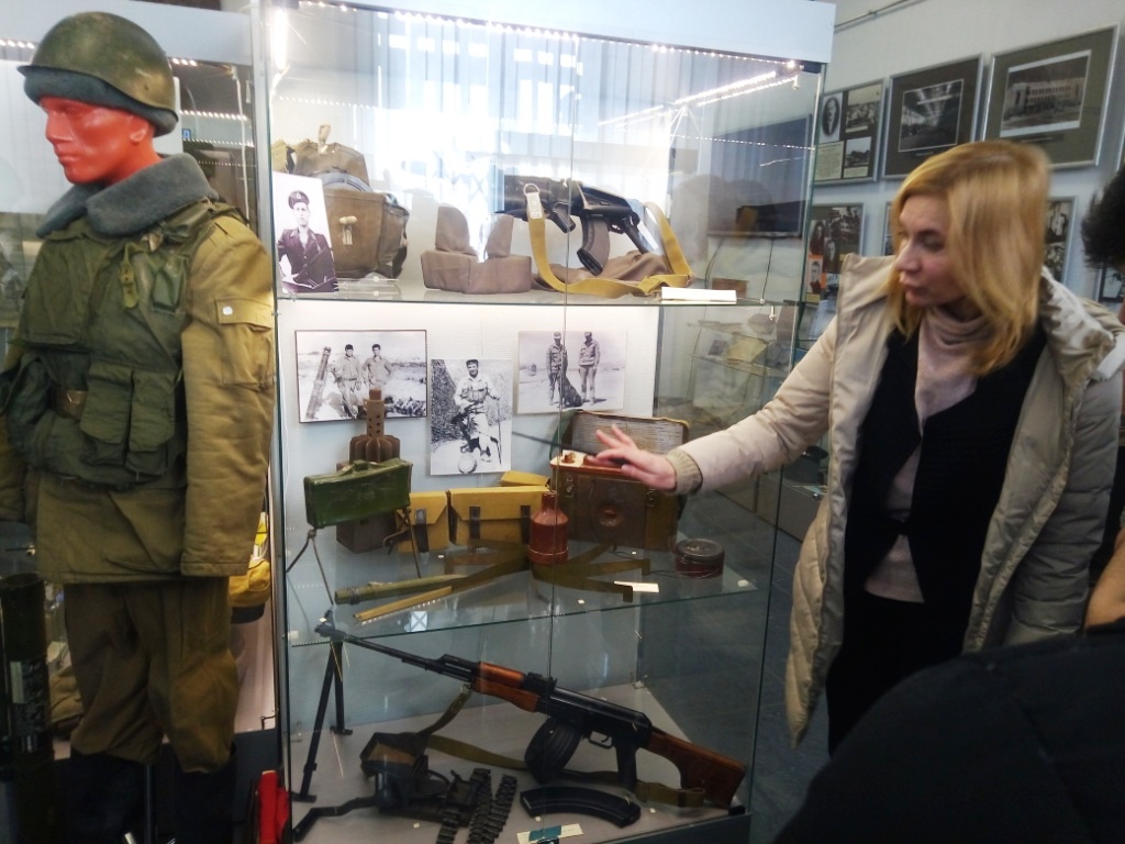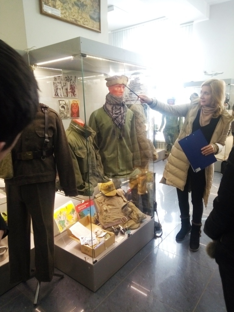 В музее представлено множество экспонатов: радиостанция Р-809, с которой на задания уходил авианаводчик Александр Андреевич Егоров, телеграфный ключ, с помощью которого зашифрованные сообщения передавал разведчик Владимир Алексеевич Шуплецов, много подлинных фотографий и документов того периода. Очень тронула студентов стена памяти воинам-интернационалистам Дзержинского района, погибшим в Афганистане и их письма родителям.