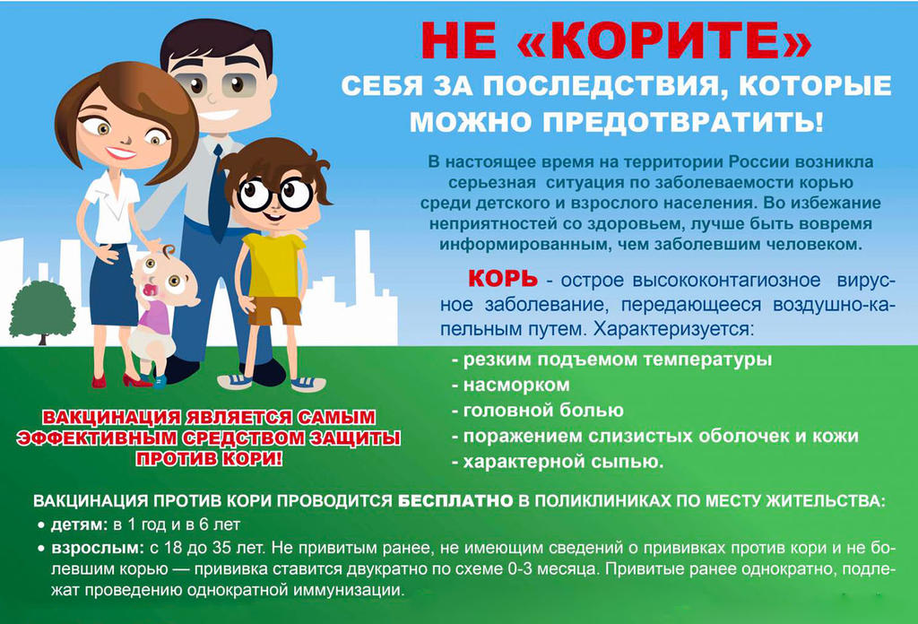 В соответствии с Национальным календарем профилактических прививок обязательная вакцинация детям против кори проводится в возрасте 12 месяцев и повторно в 6 лет. Также должны прививаться взрослые в возрасте до 35 лет, не болевшие корью, не привитые ранее или не имеющие сведений о сделанной ранее прививке против кори или перенесенной в прошлом кори лица; в возрасте 36-55 лет прививаются лица, относящиеся к группам риска (работники медицинских и образовательных организаций, организаций торговли, транспорта, коммунальной и социальной сферы).