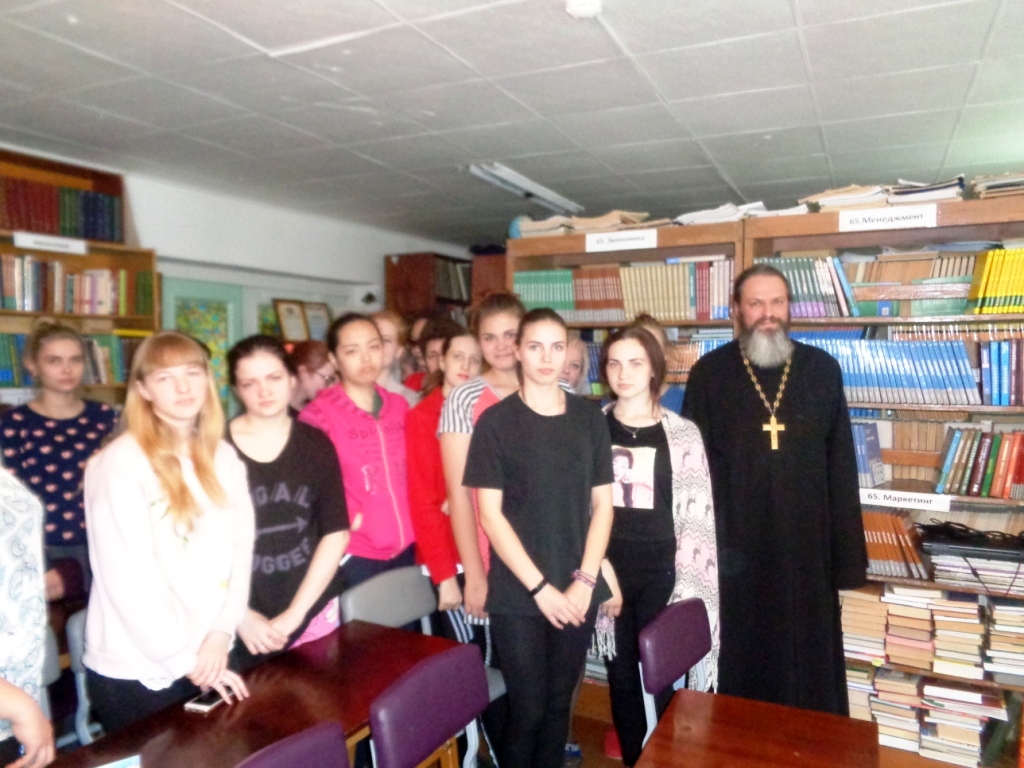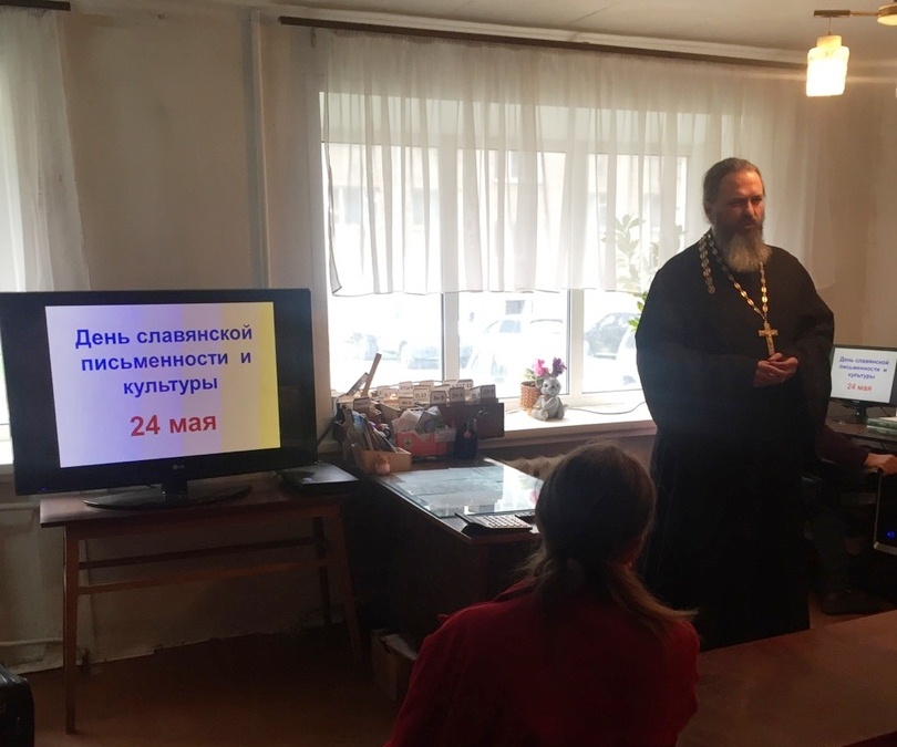 Гостем этой встречи стал настоятель храма в честь Успения Пресвятой Богородицы протоиерей Иаков Конкин. Он рассказал о святых равноапостольных Кирилле и Мефодии, которые создали славянскую азбуку, благодаря которой получали, получают и будут получать знания все поколения, живущие в разные эпохи славянской истории.