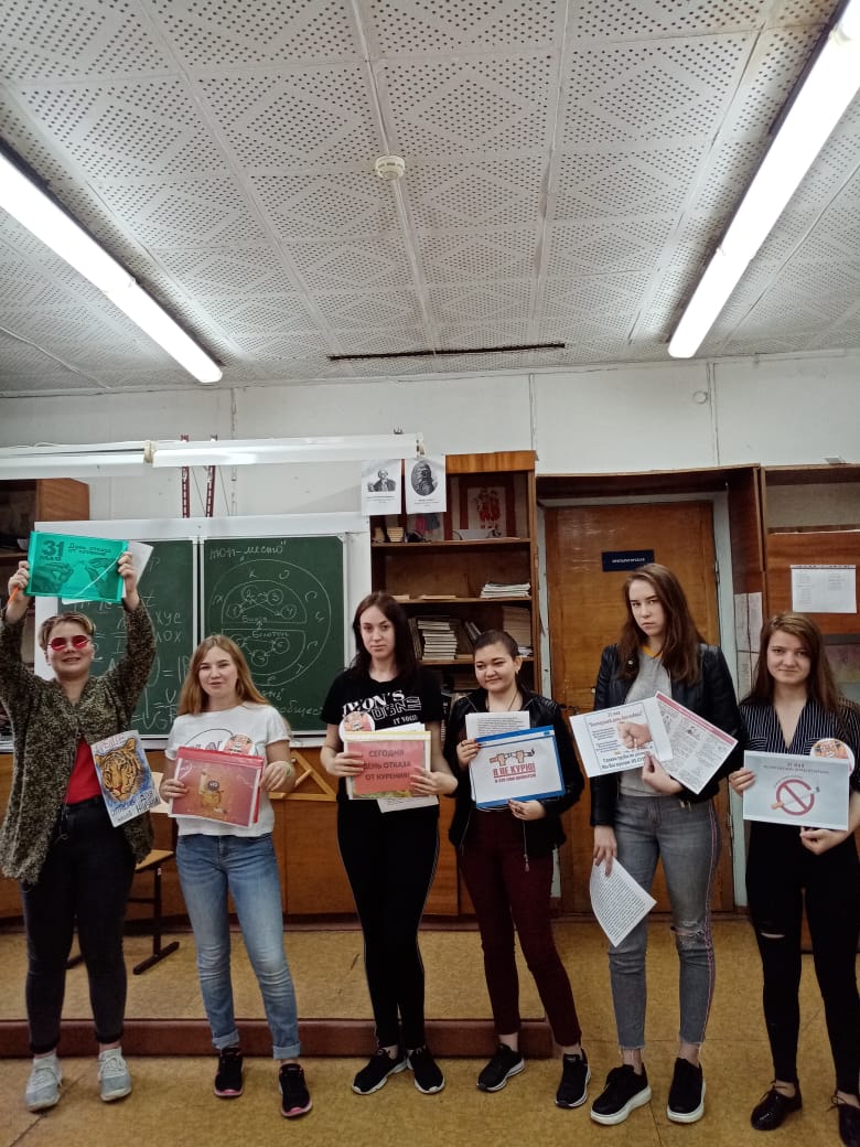 В рамках Всемирного дня без табака активисты групп 1Мх-9 - Згуевич Дмитрий, ОП-288 - Сегеда Ольга, Кащеева Арина, Говорухина Полина и 1Дд-9 - Кононенко Кристина, Корунтаева Алина и Рябченко Екатерина - провели акцию «Мы за жизнь без табака».