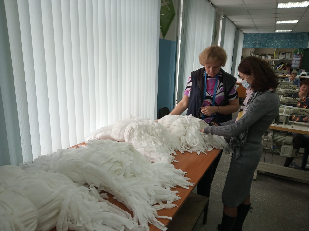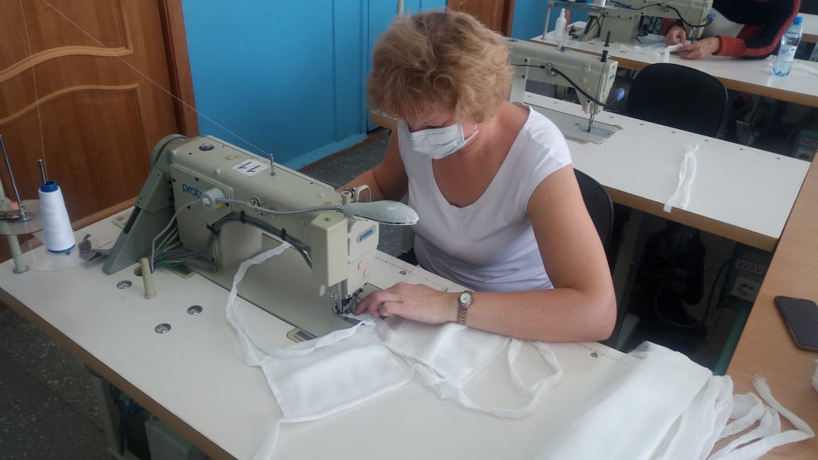 В раскройном цехе образовательной организации мастер производственного обучения Глухова Н.В. при помощи ленточного раскройного ножа готовит крой будущих медицинских масок. Затем, раскроенные детали поступают в швейный цех, где Васильева Е.Н., Катушина О.А., Абританова О.А., Полякова И.В., Богданова Е.А., Фурсикова Г.И., Ламшакова Т.Л., Целикова Н.Е., Терехова Е.Б. на профессиональном швейном оборудовании отшивают средства защиты органов дыхания. Механики колледжа Кулакова Е.А. и Кулаков С.А. качественно настроили швейные машины, в соответствии с техническими условиями на изготовление медицинских масок и оперативно следят за исправностью оборудования.