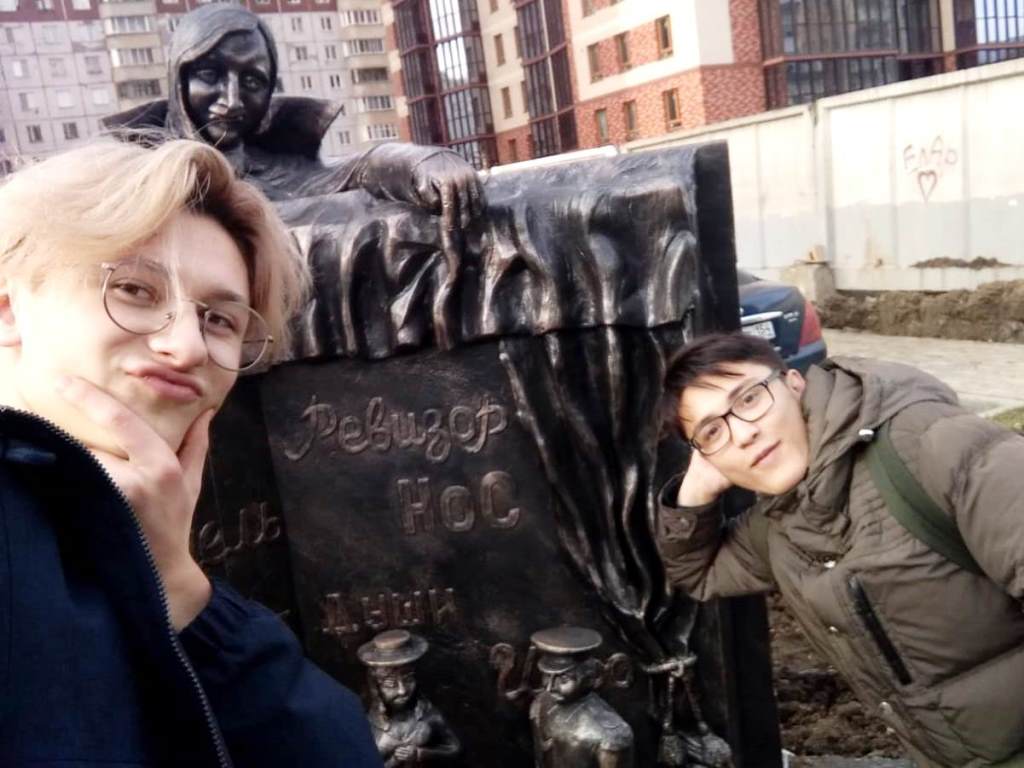 Так, рассказывая во время урока о творчестве Н.В.Гоголя, студенты представили фотографии нового памятника, расположенного недалеко от нашего колледжа. Эта скульптура посвящена героям комедии Гоголя «Ревизор».