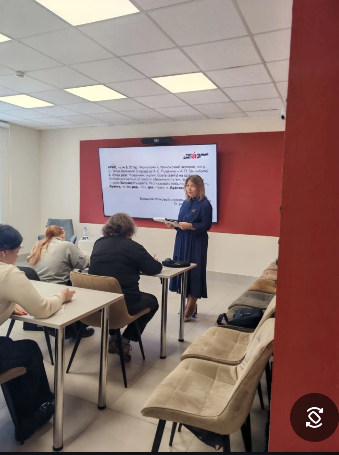Студенты первого корпуса (Бердникова Злата, Стародубова Наталья, Пинигина Арина, Тюмерекова Виктория из 1Тд-94, Полуэктов Данил из 2Тд-94, Матвеева Анастасия и Кыргыс Екатерина из 2М-92) вместе с преподавателем Соколовой Еленой Алексеевной и библиотекарем Синеоковой Мариной Вячеславовной писали диктант в библиотеке имени Макаренко. В 15:00 для них прозвучала вторая часть трилогии А. Варламова «Третий сын» — о дедушке Пушкина Осипе Абрамовиче Ганнибале и атмосфере села Михайловского.